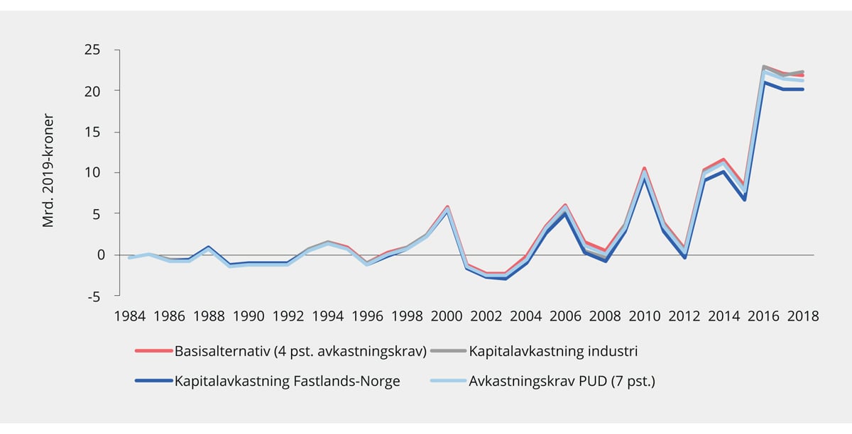 For alternativavkastningen på kapitalen er det i basisanslagene tatt utgangspunkt i et avkastningskrav på 4 pst. Avkastningskravet er hentet fra NOU 2012: 16 Samfunnsøkonomiske analyser som anbefaler dette for offentlige prosjekter med normal risiko og en horisont på mindre enn 40 år. Det er også gjort beregninger med faktiske kapitalavkastningsrater og med et avkastningskrav på 7 pst. som brukes av Olje- og energidepartementet i vurderingen av planer for utbygging og drift (PUD) for nye oljefelt.