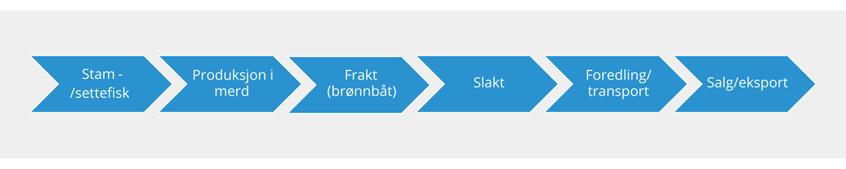 Laks, ørret og regnbueørret starter sitt liv i ferskvann i anlegg på land, der små plommesekkyngel klekker ut av eggene og deretter smoltifiseres (forberedes på livet i saltvann). Deretter flyttes fisken (heretter «settefisken») ut i merder i sjøvann hvor den vokser seg større inntil fisken er klar for slakting, eventuelt også videreforedling, før den til slutt omsettes. Figur 7.1 gir en oversikt over verdikjeden.