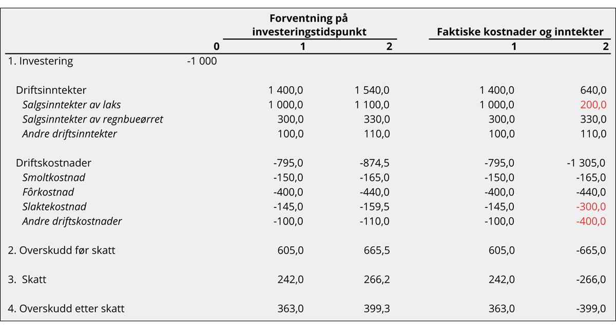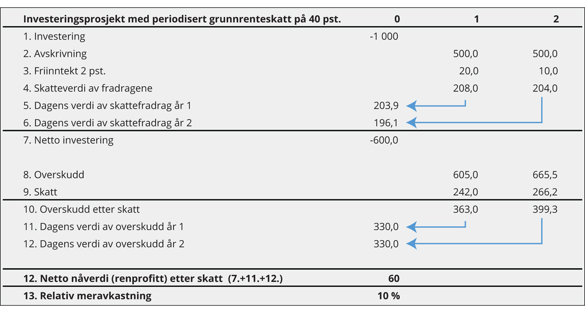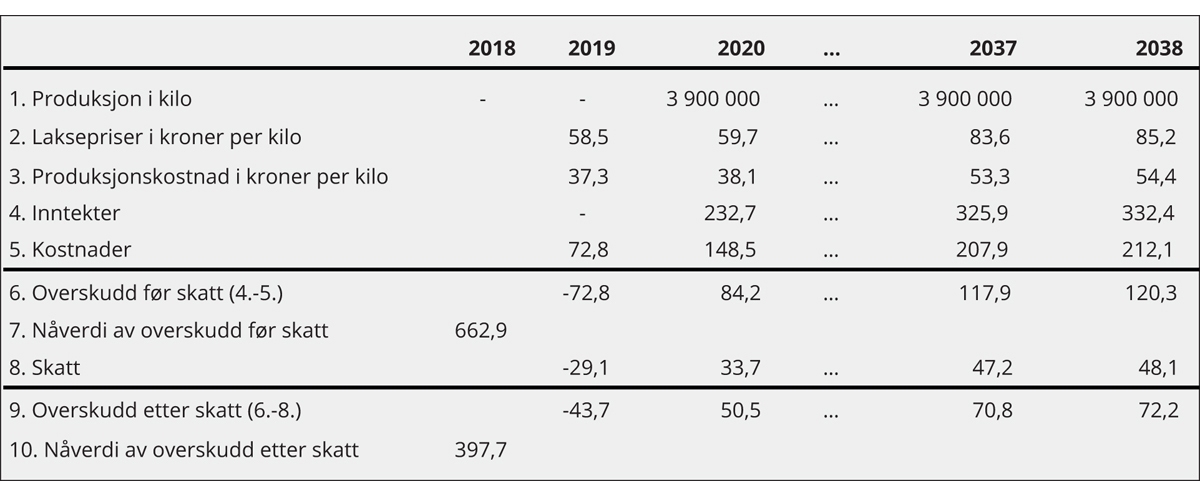 I tabell 7.1 følger en skisse av hvordan skattegrunnlaget for en periodisert, overskuddsbasert grunnrenteskatt på havbruk kan beregnes.