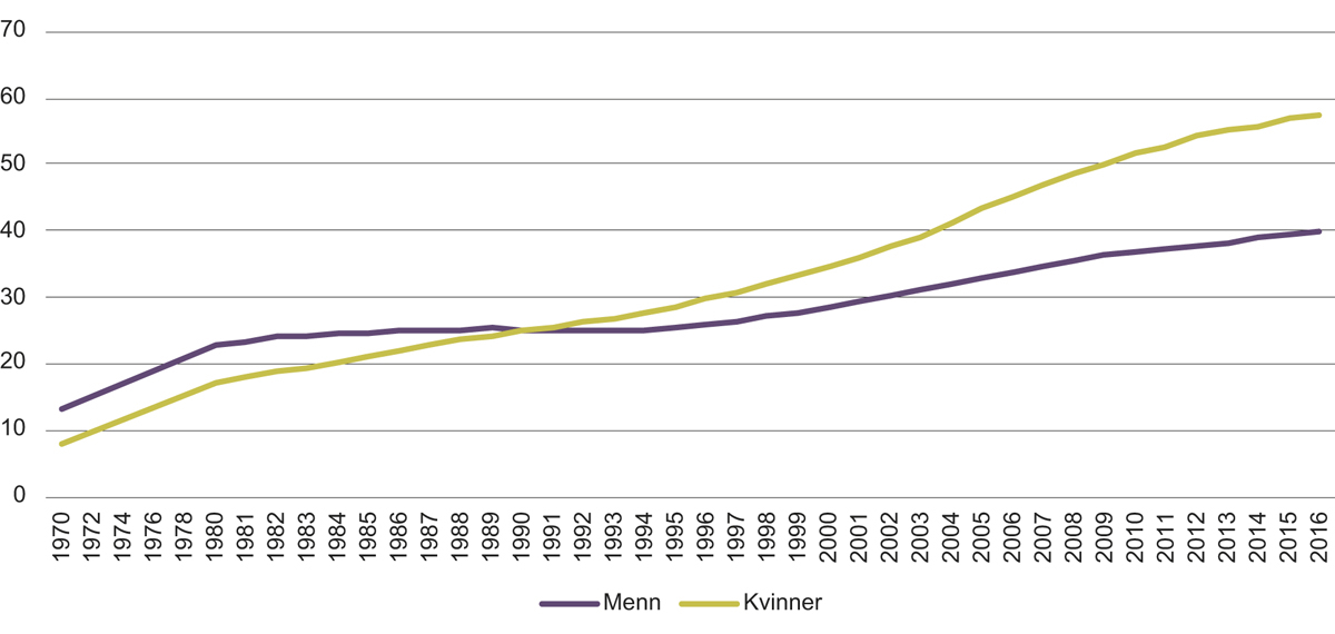 Figur 1.2 Andelen kvinner og menn i Norge med høyere utdanning i aldersgruppen 30–39 år.