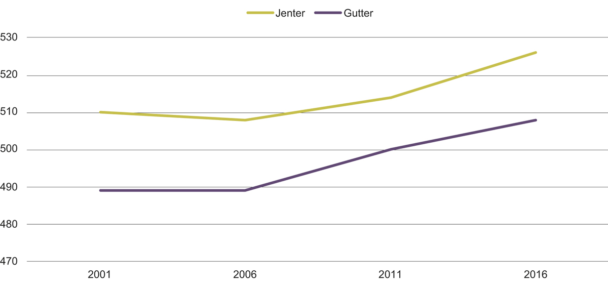 Et nokså konsistent funn er at når man hever kvaliteten på undervisningen vil både gutter og jenter bli bedre, men oftest vedvarer kjønnsforskjellene, og gjerne slik at jentene blir enda bedre i forhold til guttene enn tidligere. For eksempel bedret leseferdighetene hos norske fjerdeklassinger seg kraftig fra 2001 til 2016 både for gutter og jenter, men kjønnsforskjellene er omtrent de samme, jf. figur 1.3. Norske gutter i 2016 leser like bra som jentene gjorde det i 2001, men ligger omtrent like langt etter jentene i leseferdighet som de gjorde i 2001.