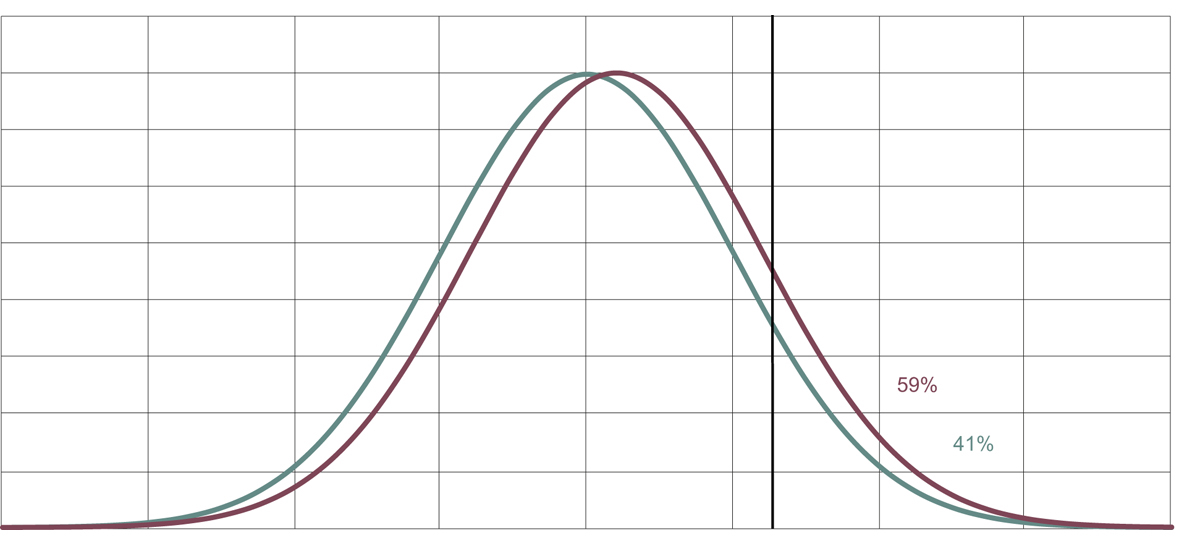 Gruppene har likt standardavvik (s = 1) og en gjennomsnittsforskjell på 0,2 standardavvik (d = 0,20). Blant de 10 prosentene med høyest skår kommer 59 prosent fra gruppen med høyest gjennomsnitt, gitt at gruppene er like store. Mange psykologiske trekk følger en normalfordeling.