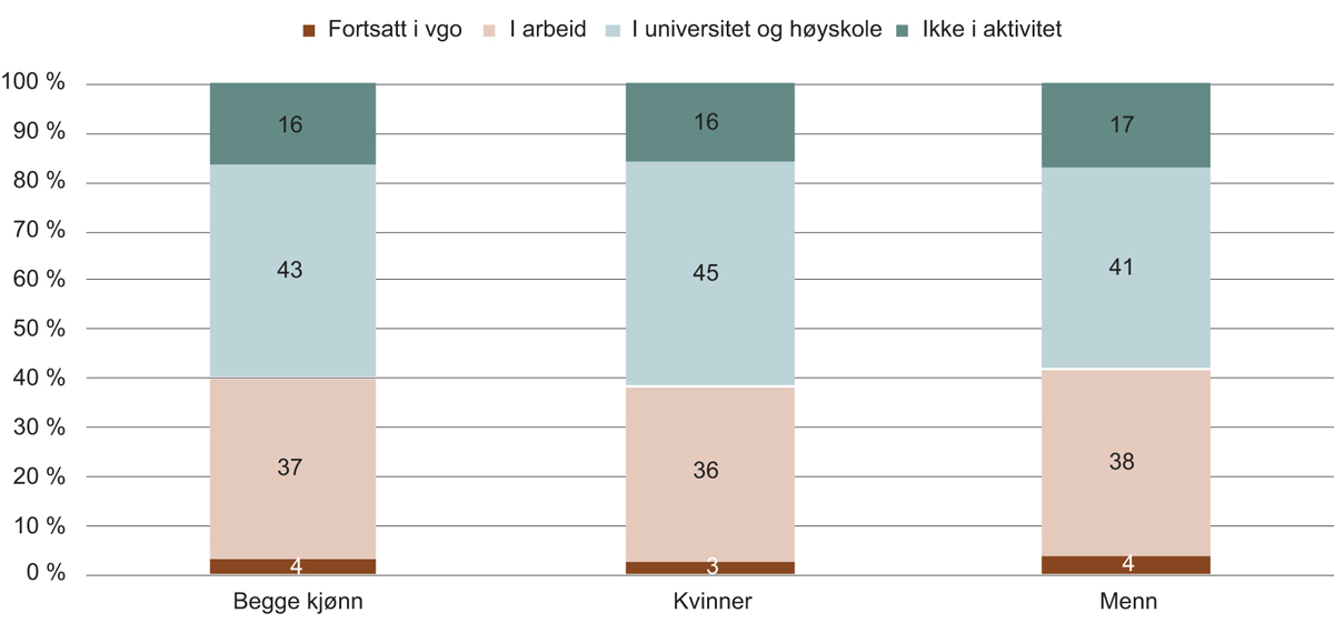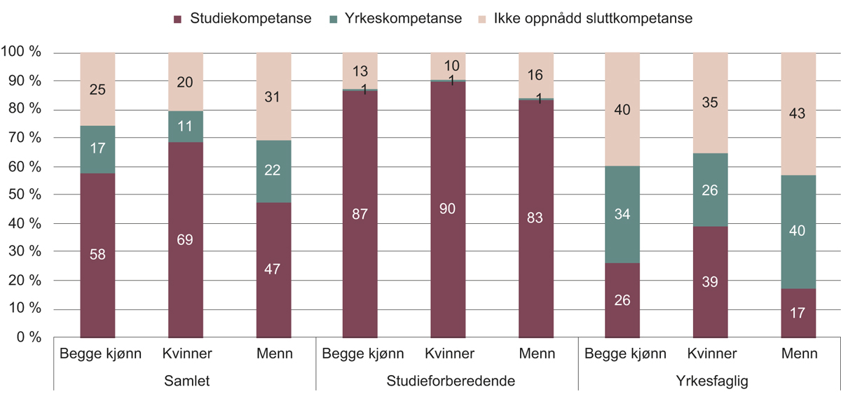 Ikke alle elevene får sitt førstevalg til utdanningsprogram innfridd. Av alle guttene som var tatt inn på Vg1 per 1. oktober 2017, gikk 54 prosent på yrkesfaglige utdanningsprogrammer mot 46 prosent på studieforberedende utdanningsprogrammer. Tilsvarende andeler for jentene var 39 prosent på yrkesfaglige og 61 prosent på studieforberedende utdanningsprogrammer. For opptaket høsten 2017 søkte i alt 73 707 elever seg til Vg1, der nær 53 prosent av søkerne var gutter og rundt 47 prosent av søkerne var jenter (Utdanningsdirektoratet, 2018e).