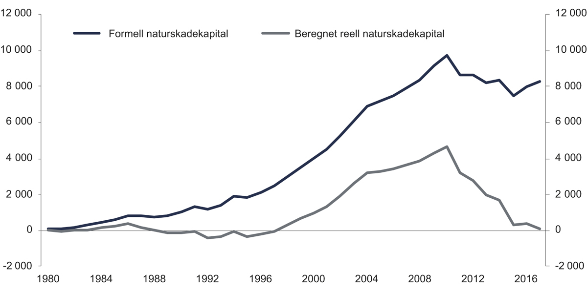Figur 15.1 viser en beregnet utvikling av reell naturskadekapital sammenlignet med den formelle naturskadekapitalen fra 1980 til 2017. Den reelle naturskadekapitalen er beregnet til 130 millioner kroner, mens den formelle naturskadekapitalen utgjør om lag 8,2 milliarder kroner. Avviket er betydelig og i størrelsesorden 8,07 milliarder kroner.