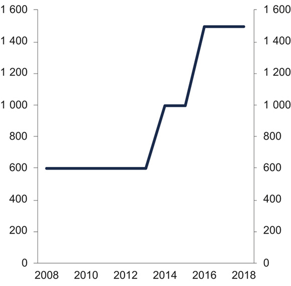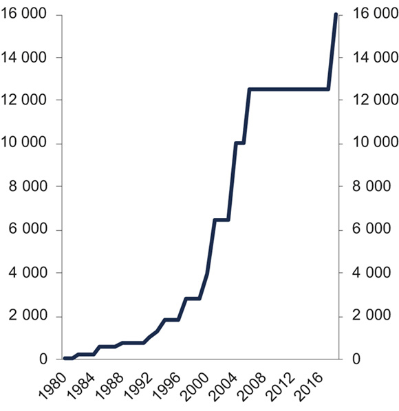 Forsikringsselskapenes samlede ansvar ved en enkelt naturkatastrofe er begrenset til et beløp som fastsettes av Kongen. Også den sikredes egenandel for hver naturskadehendelse fastsettes av Kongen. Myndigheten til å fastsette selskapenes samlede ansvar og den sikredes egenandel er delegert til Justis- og beredskapsdepartementet.16 De respektive beløpene er regulert i forskrift om egenandel og ansvarsgrense ved naturskadeforsikring.17 Egenandelen ble sist endret i 2005 og er i dag 8 000 kr. Selskapenes maksimalansvar ved en enkelt naturkatastrofe har blitt justert flere ganger, se figur 3.1. Selskapenes samlede ansvar ble sist endret i november 2017, med virkning fra 1. januar 2018, og er i dag 16 milliarder kroner.18