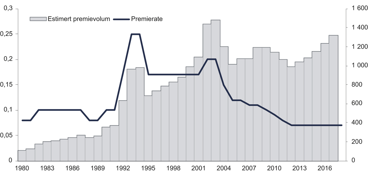Premieraten har variert betydelig over tid, se figur 3.4. Premien var relativt lav på 1980-tallet, for så å øke betydelig i 1992 etter Nyttårsorkanen og i 1993. Premienivået ble holdt relativt høyt gjennom 1990-årene, for så å reduseres gradvis fra og med 2004. Premieraten ble sist endret 1. januar 2012 og er nå 0,07 promille av brannforsikringssummen. Poolstyret besluttet i juni 2018 at premieraten fra og med 1. januar 2019 blir uforandret. Den årlige naturskadepremien for et hus som er brannforsikret for 5 millioner kroner vil derfor være 350 kroner.