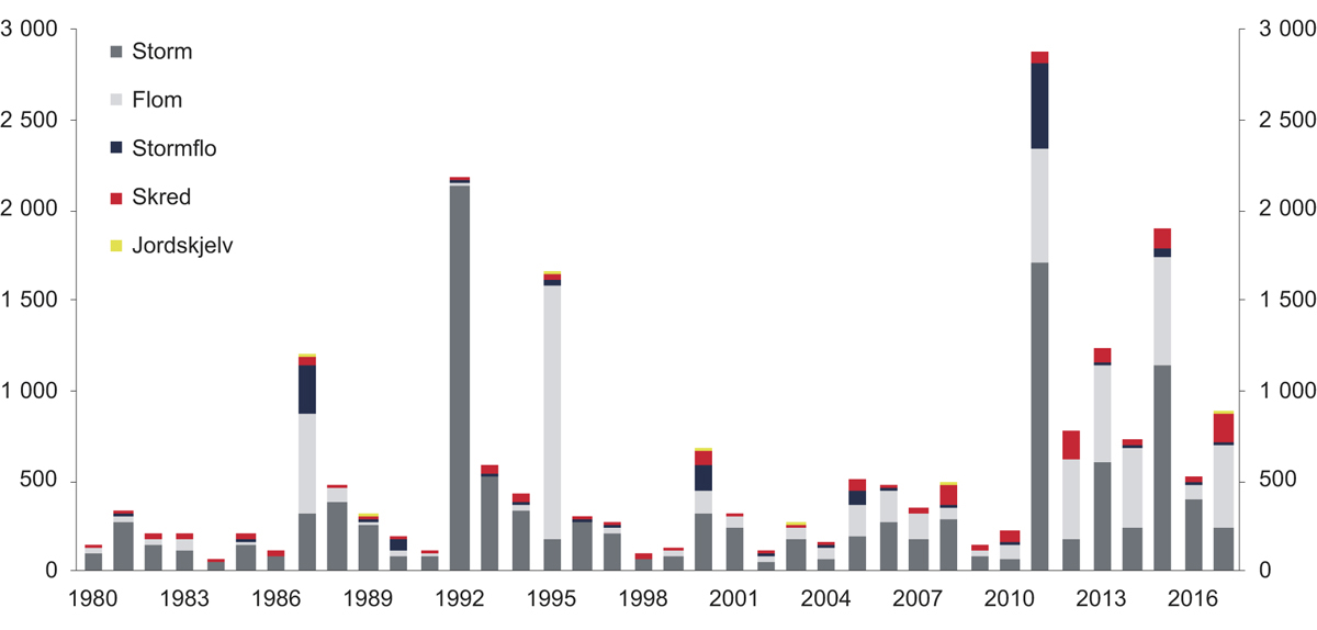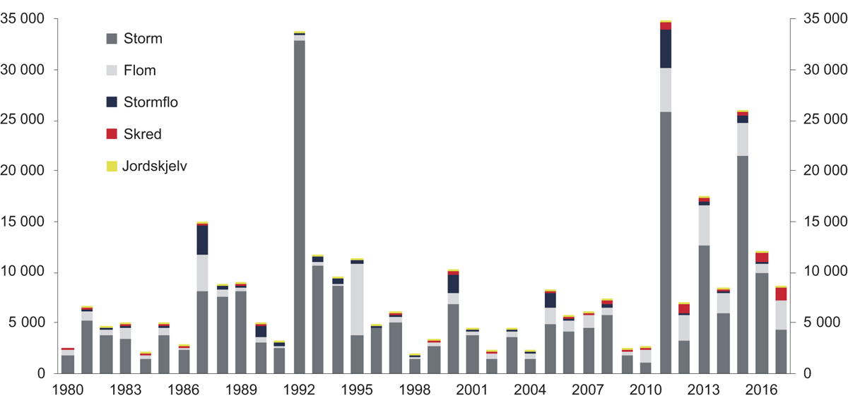 Antallet naturskader har variert betydelig i årene siden naturskadeordningen ble etablert, se figur 3.5. Som figuren viser har stormskader vært den mest utbredte skadeårsaken, både samlet sett for perioden 1980–2017, og i alle de enkelte årene med unntak av 1995. Flom er også årsak til en betydelig andel av skadene, og var i 1995 den mest utbredte skadeårsaken – hovedsakelig som følge av flommen på Østlandet («Vesleofsen»). Stormflo og skred har vært årsak til henholdsvis om lag 5 og 3 prosent av skadene i perioden. Jordskjelv har siden 1980 forårsaket et ubetydelig antall skader. Det har ikke blitt registrert skader som skyldes vulkanutbrudd.