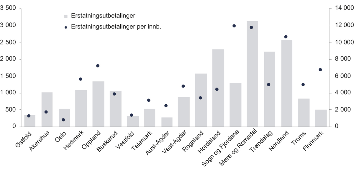 1 Tallene for erstatningsutbetalingene per innbygger er basert på befolkningstallene i fylkene per 1. januar 2018, og tar derfor ikke hensyn til relative endringer i folketallet i fylkene i perioden 1980–2017.