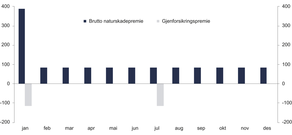Samlet premieinntekt for selskapene i naturskadeordningen utgjorde i 2018 vel 1,3 milliarder kroner. Utgifter til den felles gjenforsikringsordningen utgjorde samme år 230 millioner kroner. Når det gjelder premieinnbetaling, har ca. halvparten av privatkundene månedlige terminbetalinger av premie, mens forfall for de øvrige fordeler seg relativt jevnt ut over året. For næringskunder foregår premieinnbetaling stort sett en gang i året og mesteparten rundt 1. januar. Den felles gjenforsikringspremien innkreves halvårlig (januar/februar og juni/juli). Premieinnbetaling og avgitt gjenforsikringspremie er vist grafisk i figur 8.1.