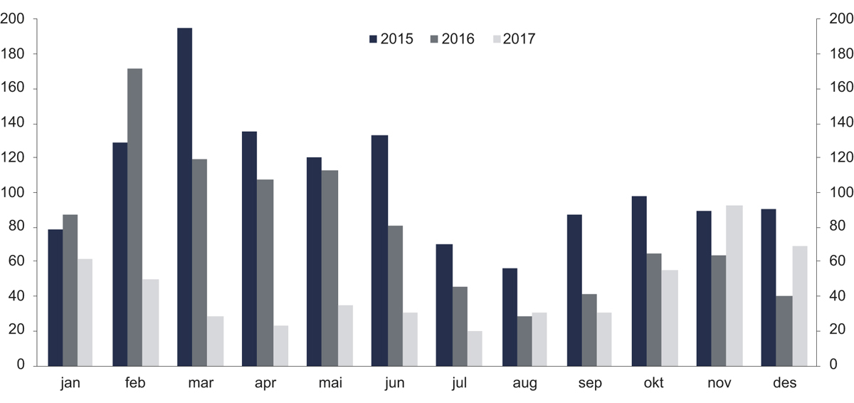Figur 8.2 Utbetalt erstatning per betalingsmåned 2015–2017. Millioner kroner