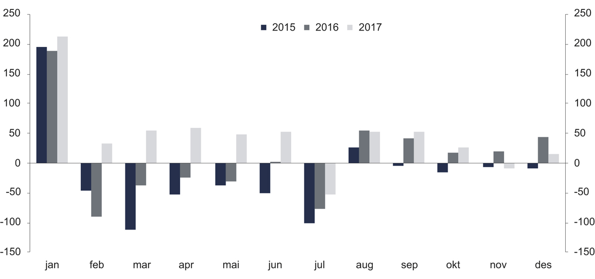 Figur 8.3 Premie fratrukket betalt erstatning per betalingsmåned 2015–2017. Millioner kroner