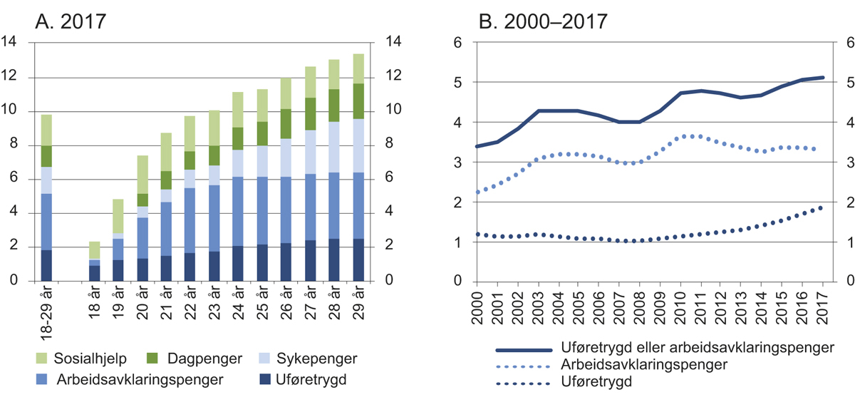 Ved utgangen av 2017 mottok i underkant av 100 000 unge i alderen 18–29 år en livsoppholdsytelse fra NAV. For mer enn 60 prosent var dette en helserelatert ytelse, se figur 6.1 A. For befolkningen som helhet har andelen som mottar arbeidsavklaringspenger eller uføretrygd, økt med i underkant av 10 prosent siden 2000. For unge under 30 år har denne andelen økt med 50 prosent fra 3,4 til 5,1 prosent, se figur 6.1 B. Andelen på arbeidsavklaringspenger økte fra 2,2 til 3,4 prosent, og stod dermed for størstedelen av den samlede økningen.