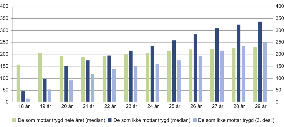 Figur 6.2 viser at i aldersgruppen 18–24 år er inntektsnivået betydelig høyere for personer som mottar trygd hele året enn for de som ikke mottar trygd. Medianinntekten for trygdemottakere i denne aldersgruppen er rundt 30 prosent høyere enn medianinntekten for de uten trygd. Dette gjelder selv om vi her bruker et utvidet inntektsbegrep som inkluderer studielån i tillegg til trygdeytelser, sosialhjelp og andre inntekter, for i størst mulig grad inkludere alle midler som er til disposisjon.