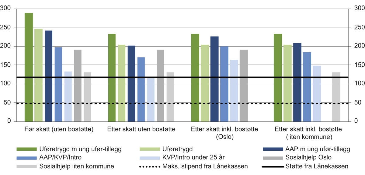 Basert på regelverk og satser for 2019. For stolpene som viser sosialhjelp, er veiledende sosialhjelpssatser for Oslo kommune og Rollag kommune i Numedal (liten kommune) lagt til grunn. Sosialhjelpssatser inkluderer ikke støtte til utgifter til bolig og strøm. Et konservativt anslag for disse utgiftene er lagt til sosialhjelpssatsene (750 kr i månedlige strømutgifter. Månedlige utgifter til bolig som er lagt til grunn er 8 000 kroner i Oslo og 4 000 kroner i Rollag). I beregningene med bostøtte er boutgiftene satt så høyt at de tilsvarer maksimalt godkjente boutgifter. Utbetalt bostøtte er avhengig av hvor i landet du bor siden boutgiftene varierer med bosted. Kategorien «Etter skatt inkl. bostøtte (Oslo)» betyr at mottaker bor i Oslo. Kategorien «Etter skatt inkl. bostøtte (liten kommune)» betyr at bostøtte er beregnet som om mottaker bor i en liten eller mellomstor kommune. «AAP» er arbeidsavklaringspenger, «KVP» er kvalifiseringsstønad og «Intro» er introduksjonsstønad.