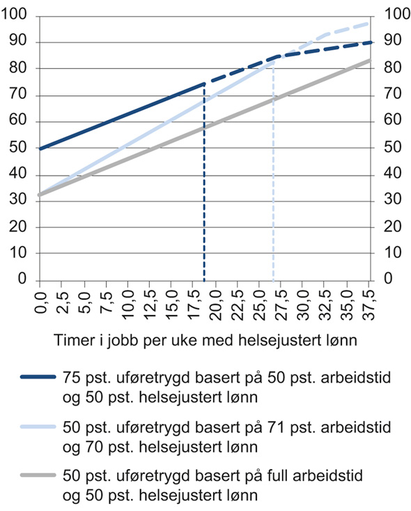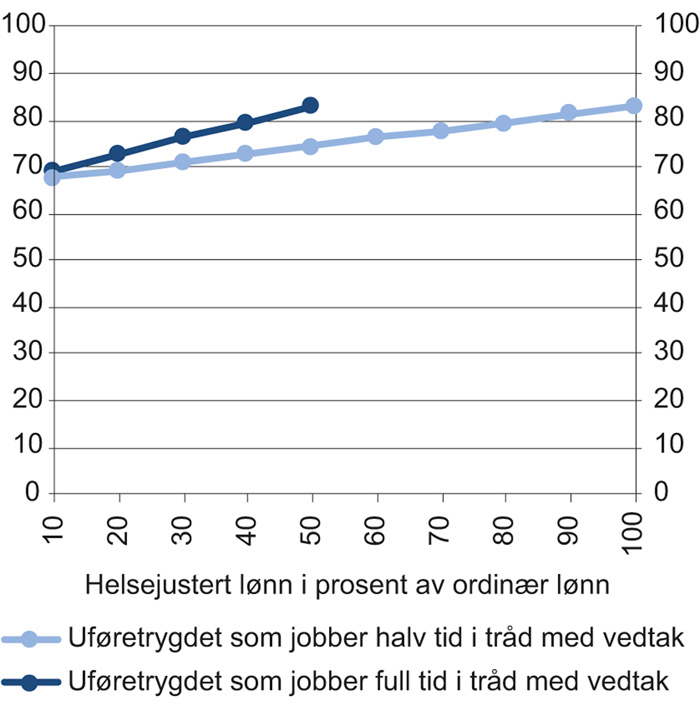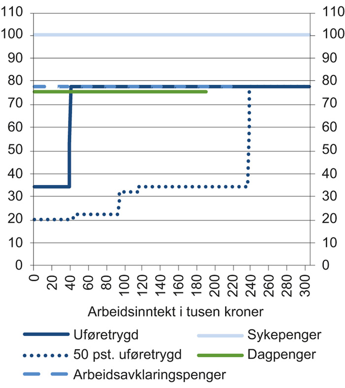 Det er flere grunner til at trygdeytelsene for unge bør ses i sammenheng med inntektsnivået for andre personer i samme aldersgruppe. En viktig grunn er økonomiske insentiver. Inntektsnivået for andre personer i samme aldersgruppe gir et bilde av hva en trygdemottaker kan regne med å disponere dersom han eller hun ikke mottar trygd. Figur 6.2–6.3 tyder dermed på at unge trygdemottakere gjennomgående vil komme betydelig bedre ut økonomisk på kort sikt ved å være trygdet enn dersom de ikke mottok trygd. Det gir en uheldig insentivvirkning som trolig bidrar til at flere blir trygdet. Samtidig er det på lang sikt betydelige gevinster ved å være i arbeid framfor å motta trygd, se avsnitt 5.5.