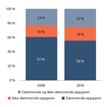 Figuren viser fordelingen av arbeidsbelastningen mellom dømmende og ikke-dømmende oppgaver i 2008 og 2018. Det er viktig å presisere at figuren ikke sier noe om den totale arbeidsbelastningen for tingrettene, bare om fordelingen av belastningen.