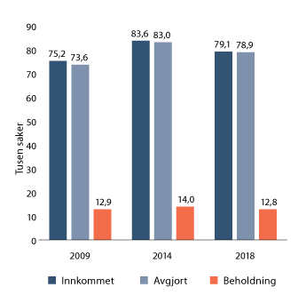 Antall innkomne saker, avgjorte saker og beholdningen av tvistesaker og straffesaker i årene 2009, 2014 og 2018 vises i figur 5.3. Det er grunn til å understreke at sakene her ikke er vektet.