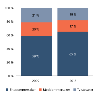 Figur 5.4 viser at andelen enedommersaker har økt i perioden, mens de to øvrige sakstypene har falt noe.