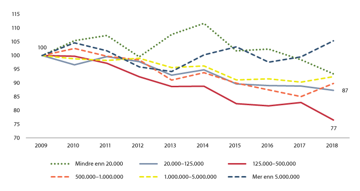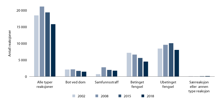 Av sakene som pådømmes i tingrettene, utarbeider SSB relativt detaljert informasjon om sakene som ender med en straffereaksjon.15 Figur 5.6 viser utviklingen i straffereaksjoner i tingrettene i 2002, 2008, 2015 og 2018.