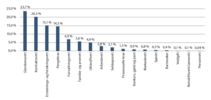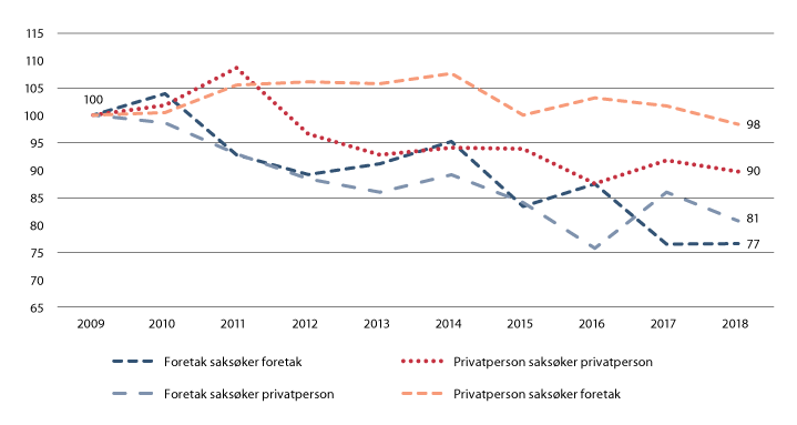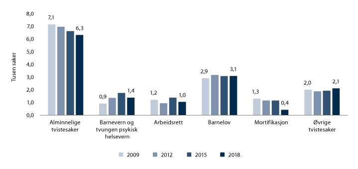 Kartleggingen gjelder saker i de alminnelige domstolene i perioden 2008–2018.10 Fremstillingen i det videre er konsentrert om saker som bringes inn for tingrettene, som er førsteinstans i nesten alle saker.11 Om lag 90 prosent av sakene får sin endelige avgjørelse der. Saksinngangen i tingrettene, i tillegg til partenes tilbøyelighet til å anke, er førende for saksmengden i annen- og tredjeinstans.