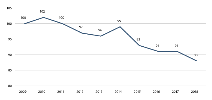 Figur 5.3 Sivile saker og straffesaker i tingrettene, 2009, 2014 og 2018