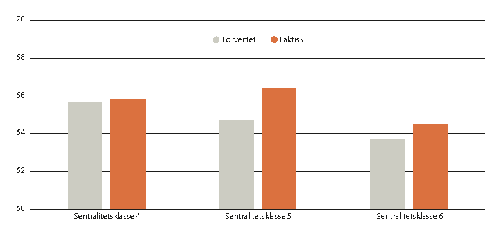 I figur 2.10 sammenlignes forventet sysselsettingsandel – det vil si samlet sysselsettingsandel dersom andelene hadde vært lik landsgjennomsnittet for begge kjønn og alle alderstrinn – med faktiske sysselsettingsandeler for sentralitetsklassene 4, 5 og 6.