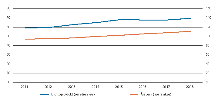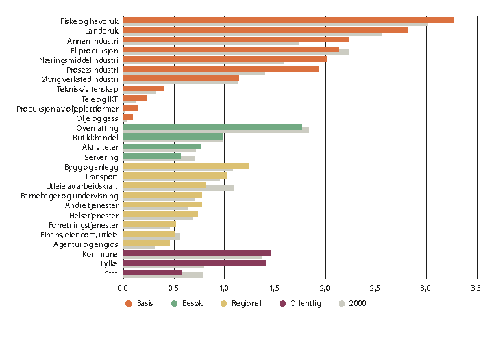 I dette avsnittet beskrives næringsstrukturen i ulike deler av landet og i de ulike sentralitetsklassene. Utgangspunktet er de ulike næringenes samlede verdiskaping, eller bruttoprodukt, se boks 2.1. Et alternativ er å bruke sysselsetting for å vurdere næringenes relative størrelse. For de fleste næringer gir metodene ganske like resultater. For enkelte næringer, særlig havbruk og kraftproduksjon, vil imidlertid metoden påvirke resultatet betydelig.