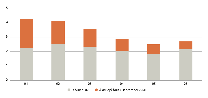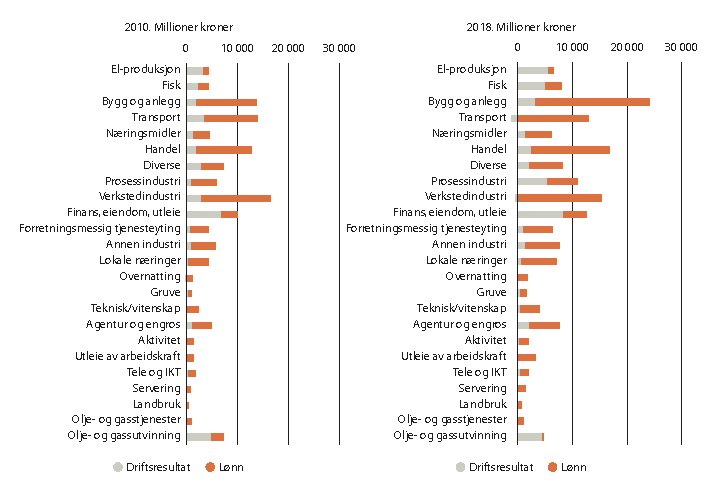 Umiddelbare konsekvenser av krisen var mer beskjedne for industrien enn for tjenesteytende næringer (Menon Economics, 2020a). Langsiktige utsikter er imidlertid dystrere for industrien enn både varehandelen og mesteparten av reiselivsnæringen, anslår Menon som vurderer at verdiskapingen i industrien vil gå ned de to neste årene. Dette har blant annet sammenheng med utsiktene for oljenæringen. Fallet i oljeprisen gjennom våren 2020 rammet både umiddelbar inntjening og langsiktige utsikter for norske oljeselskaper og norsk leverandørindustri. Statistisk sentralbyrå anslår for eksempel at oljeinvesteringene på norsk sokkel skal falle med 14 prosent fra 2019 til 2021. Det vil i tilfelle frigjøre mye arbeidskraft, som i stor grad vil finne sysselsetting i andre næringer.