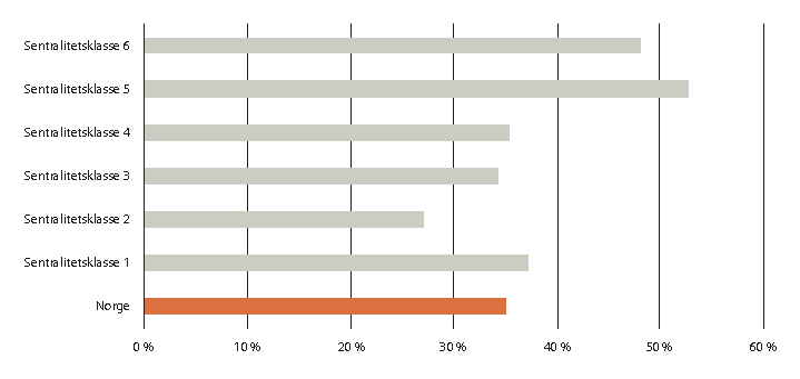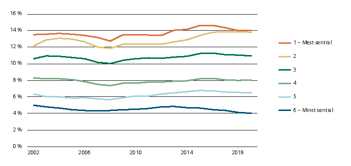 6 – minst sentral | 113 | 235 729 | 198 | 9 623 | 104 929 | 4,4 % | 3,9 % | Minst sentrale kommuner |