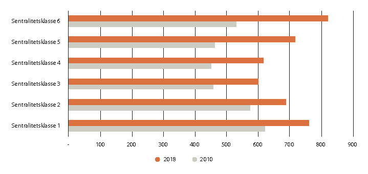 Utviklingen er ganske stabil for sentralitetsklassene 5 og 6, med en jevnt svakere utvikling nesten hvert eneste år. Sentralitetsklasse 4 hadde noen år tidlig i perioden med sterkere utvikling enn landsgjennomsnittet.