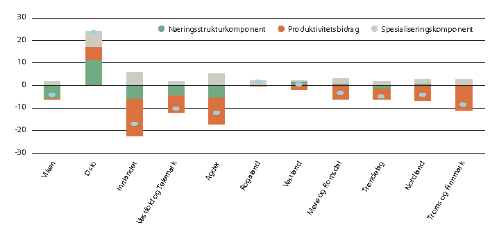 Det er relativt store fylkesvise forskjeller i næringsstrukturen. Primærnæringene er viktige i mange av landets fylker. Fiske og havbruk er viktig fra Vestland og nordover langs kysten, mens landbruk har relativt stor betydning i Innlandet og Trøndelag. Foredlingsindustrien knyttet til primærnæringene følger i stor grad samme geografiske mønster. I kystfylkene fra Viken til og med Rogaland spiller primærnæringene en mer beskjeden rolle.