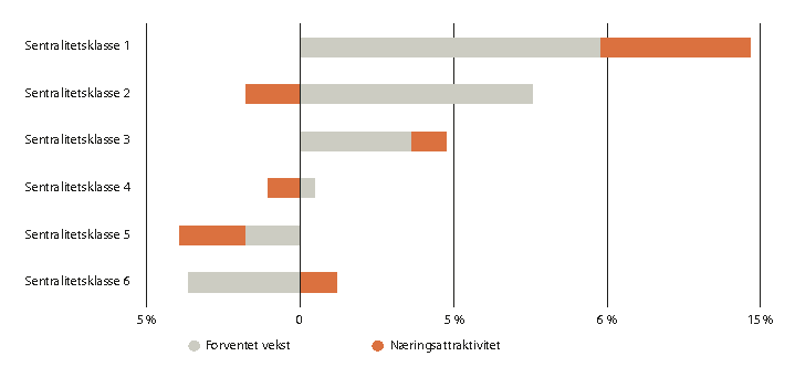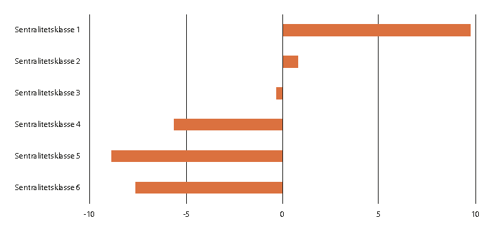 Ikke desto mindre har også veksten i næringslivets sysselsetting vært sterkest i sentralitetsklassene 1, 2 og 3, med en vekst på om lag 20 prosent i løpet disse årene. I sentralitetsklasse 4 har veksten vært 10 prosent, mens sysselsettingen i næringslivet er uendret i klasse 5 og har falt med 5 prosent i klasse 6.