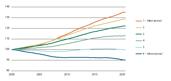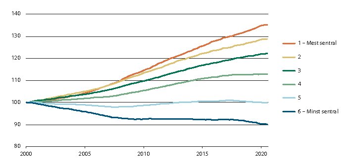 Figur 2.3 Utvikling i folketallet for ulike sentralitetsklasser. Indeks, 2000=100