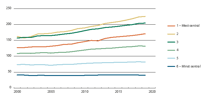 For offentlig sektor har det vært en vekst i sysselsettingen for alle sentralitetsklasser utenom sentralitetsklasse 6 siden 2000, se figur 2.4. For sentralitetsklassene 1–3 har veksten vært mellom 30 og 40 prosent, mens sysselsettingen har steget med 20 prosent i sentralitetsklasse 4, og 10 prosent i klasse 5. I sentralitetsklasse 6 har sysselsettingen i offentlig sektor falt med 1 prosent siden 2000.