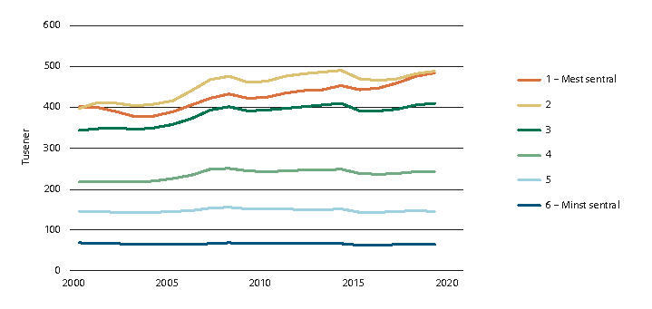 Kommunene i sentralitetsklasse 6 har hatt en nedgang i folketallet på 9,9 prosent siden 2000. Folketallet i sentralitetsklasse 5 har vært mer stabilt. For begge disse klassene falt folketallet markert i første del av denne perioden, og har falt siden 2017. Folketallet i de fire mest sentrale klassene har steget nokså uavbrutt siden 2000.