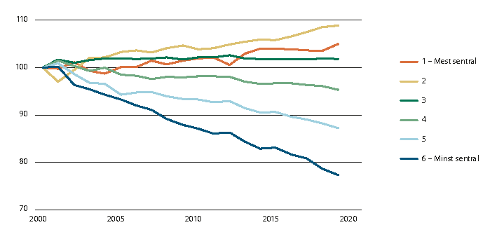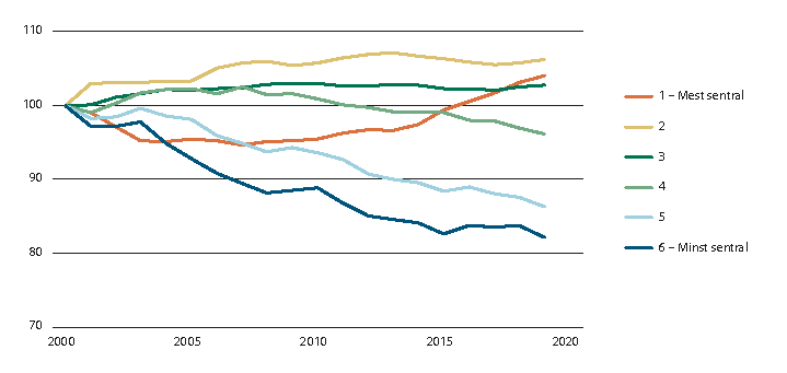 Også i næringslivet har veksten i sysselsetting vært sterkest i sentrale strøk, og svakest i distriktene, se figur 2.8. Forskjellen mellom sentralitetsklassene er imidlertid mindre enn for offentlige arbeidsplasser. Indeksverdien for sentralitetsklasse 6 er 82, mot 77 for offentlig sektor. Klassen med høyest vekst er sentralitetsklasse 2, med en verdi på 106.