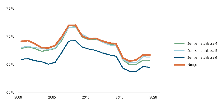 Sysselsettingsandelen blir her beregnet som prosentvis andel av befolkningen mellom 15 og 74 år som er sysselsatt. Utviklingen i sysselsettingsandelen i kommuner med ulik sentralitet er vist i figur 2.9.