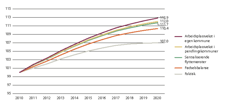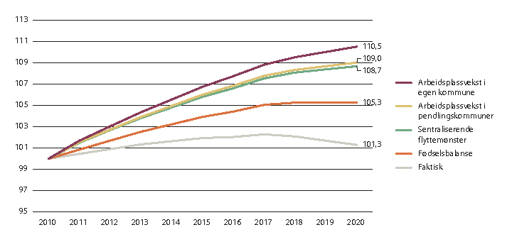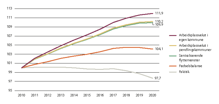 De hypotetiske banene viser at den svake befolkningsveksten i sentralitetsklasse 4 og 5 i hovedsak er forårsaket av svakere fødselsbalanse og et sentraliserende flyttemønster i befolkningen.
