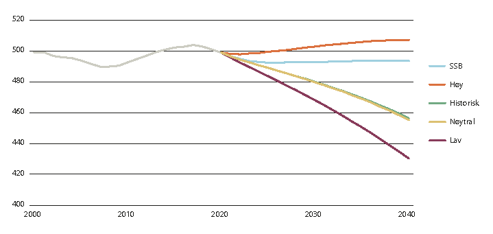 Statistisk sentralbyrå lager framskrivinger for befolkningen i Norge og for enkeltkommuner. Den siste framskrivingen av befolkningen for kommunene ble publisert 17. august 2020. I framskrivingene legger Statistisk sentralbyrå til grunn ulike nasjonale forutsetninger om utviklingen i innvandring til Norge, fremtidig fruktbarhet og levealder. Statistisk sentralbyrå har et hovedalternativ som representerer den mest sannsynlige utviklingen. I denne utredningen brukes bare dette hovedalternativet. Statistisk sentralbyrås framskrivinger av flytting baserer seg på historiske flyttemønstre hvor kommuners innenlands innflytting og utflytting og kommuners utvandring og innvandring til utlandet beregnes separat. Statistisk sentralbyrå bruker detaljerte historiske flyttedata som tar hensyn til alder og kjønn i befolkningen.