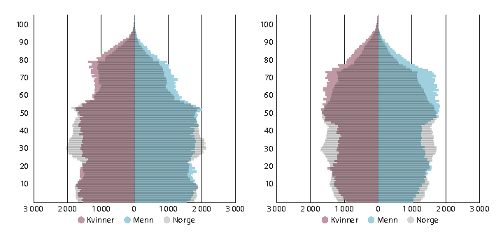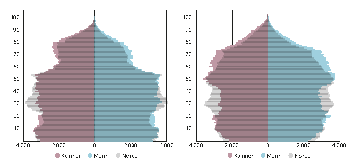 Figur 3.17 Alderspyramiden til kommuner i sentralitetsklasse 4 i 2000 (venstre) og 2020 (høyre). Personer per årsklasse for sentralitetsklassen, indeksert antall for Norge.