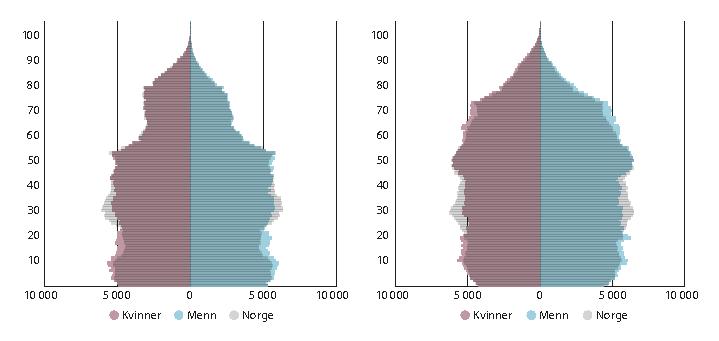 Figur 3.16 Alderspyramiden til kommuner i sentralitetsklasse 5 i 2000 (venstre) og 2020 (høyre). Personer per årsklasse for sentralitetsklassen, indeksert antall for Norge.
