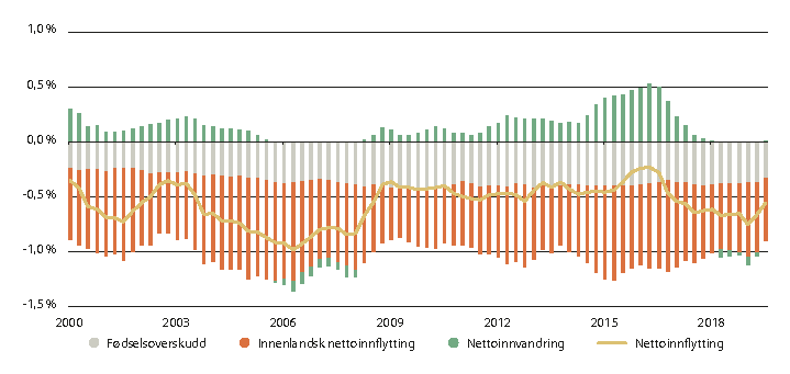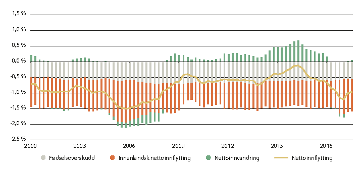 Fra 2000 til 2020 har distriktskommunene hatt en utvikling der andelen av innbyggere som er mellom 20 og 40 år har blitt vesentlig mindre. Den lavere andelen kvinner i denne aldersgruppen har, i kombinasjon med lavere fruktbarhetstall, allerede gitt seg utslag i en stor nedgang i fødselstallene.