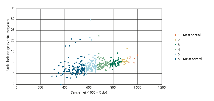 Ved utgangen av september var ledigheten fremdeles høyere i de mest sentrale kommunene. Kommunene i sentralitetsklasse 1 hadde i gjennomsnitt en registrert arbeidsledighet på 4,3 prosent av arbeidsstyrken, mens den var jevnt synkende gjennom sentralitetsklassene til 2,7 prosent i klasse 6 , se figur 4.3.