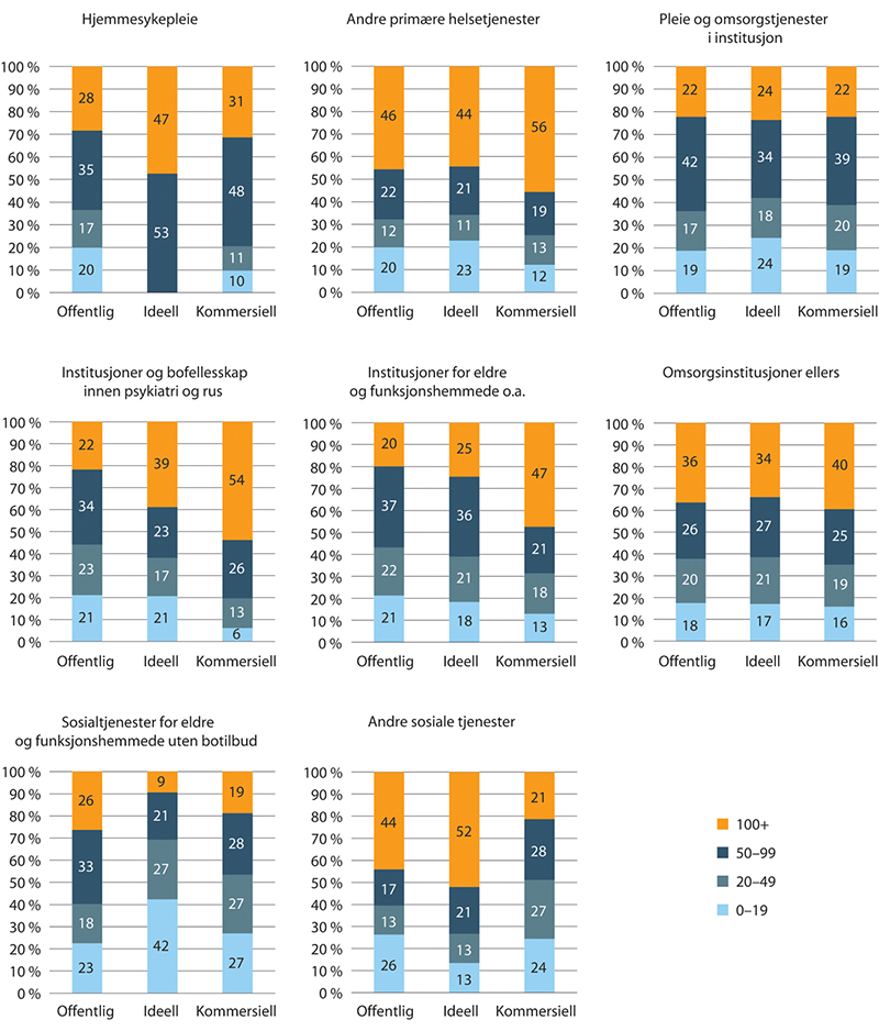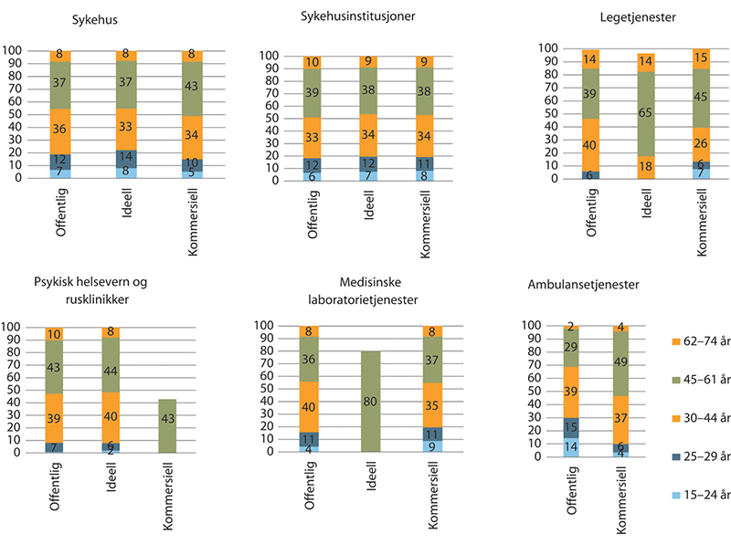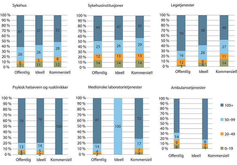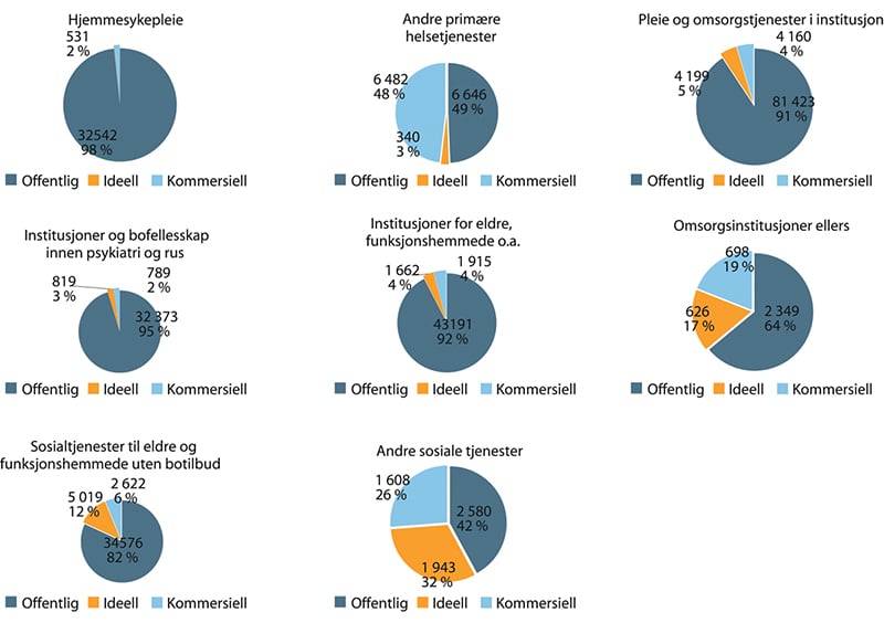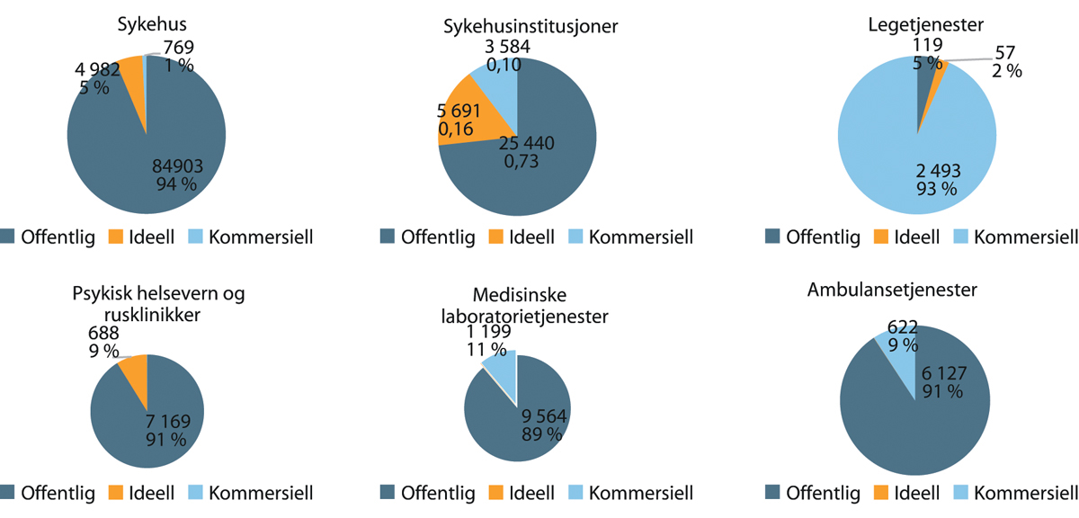 Innenfor sykehus er nesten 95 prosent offentlige ansatte, ideelle utgjør 5 prosent, mens det er svært få kommersielle. Innenfor sykehusinstitusjonene er 73 prosent offentlig ansatte, 17 prosent ideelle og 10 prosent er kommersielle. Legetjenester er dominert av kommersielle, hvorav 93 prosent av de ansatte jobber i en kommersiell virksomhet.