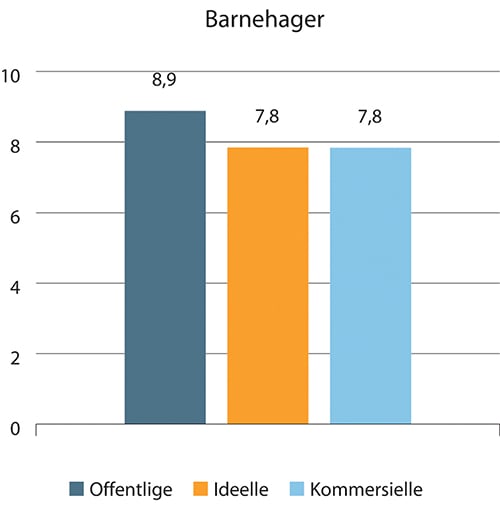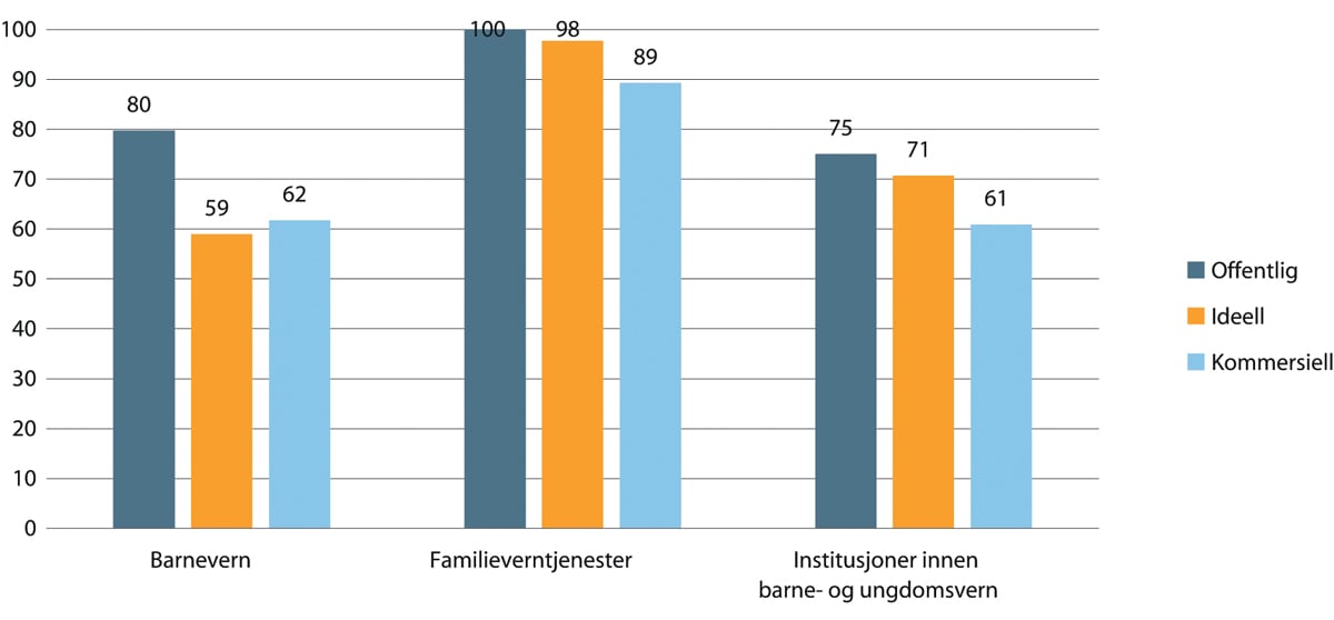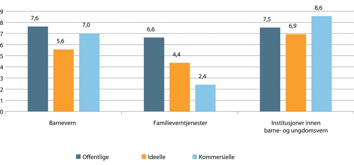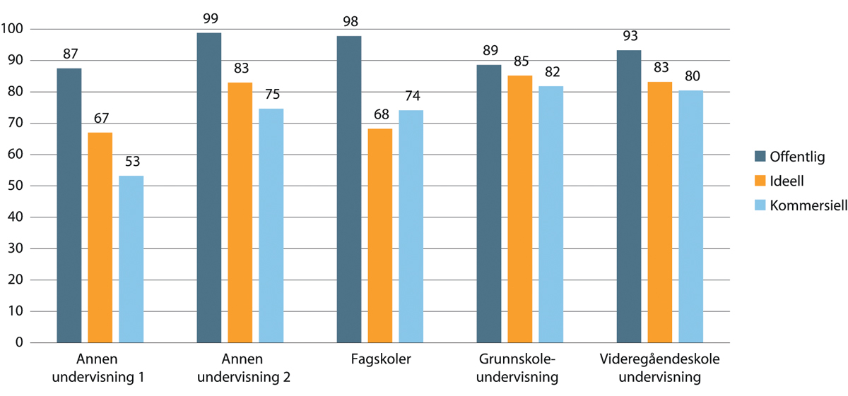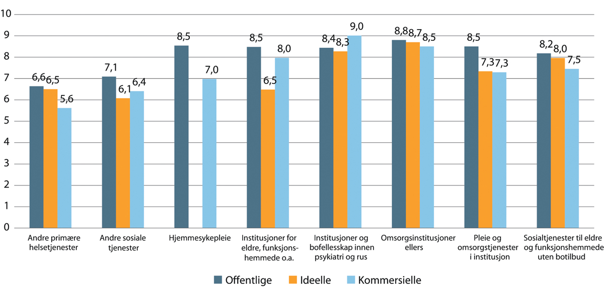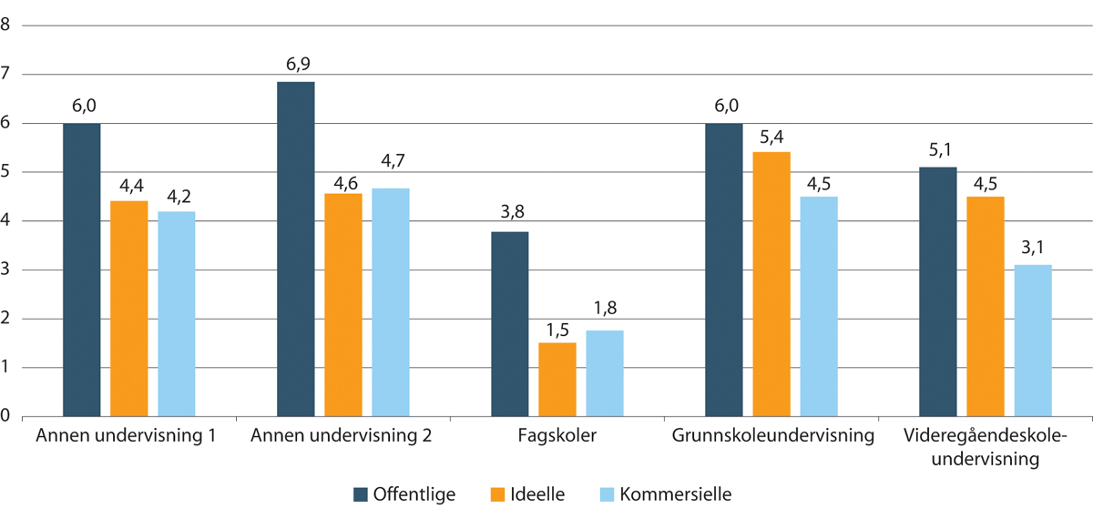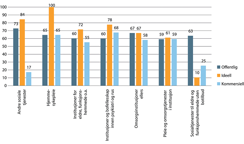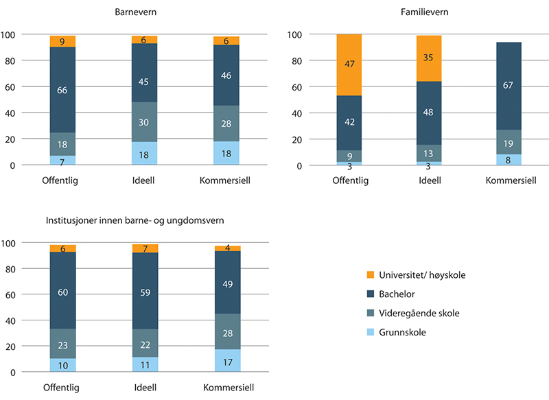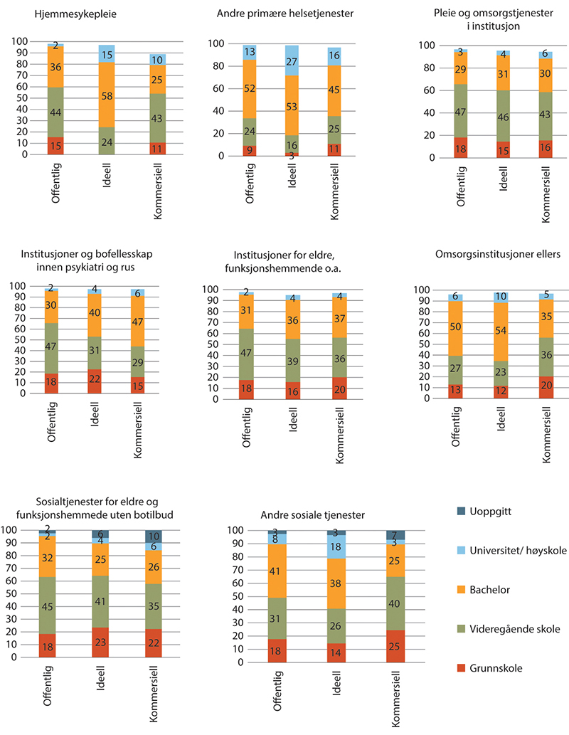 Oppsummert viser tallene at kun i ambulansetjenester er andel ansatte med høyere utdanning høyere blant kommersielle sammenlignet med offentlige og ideelle. I alle de andre tjenestenæringene er andel med høyere utdanning lavest blant kommersielle. Kun i sykehus har ideelle betydelig høyere andel med høyere utdanning enn offentlige virksomheter. Ellers er det de offentlige som skiller seg ut med høyest andel ansatte med høyere utdanning i alle sektorer.