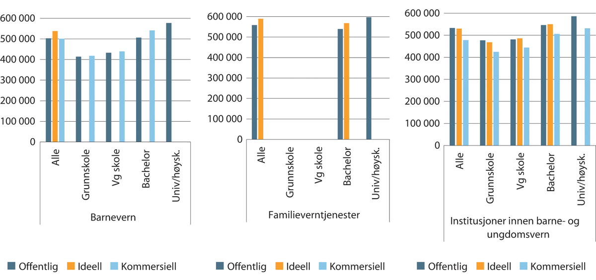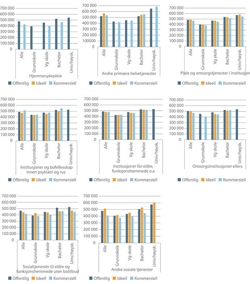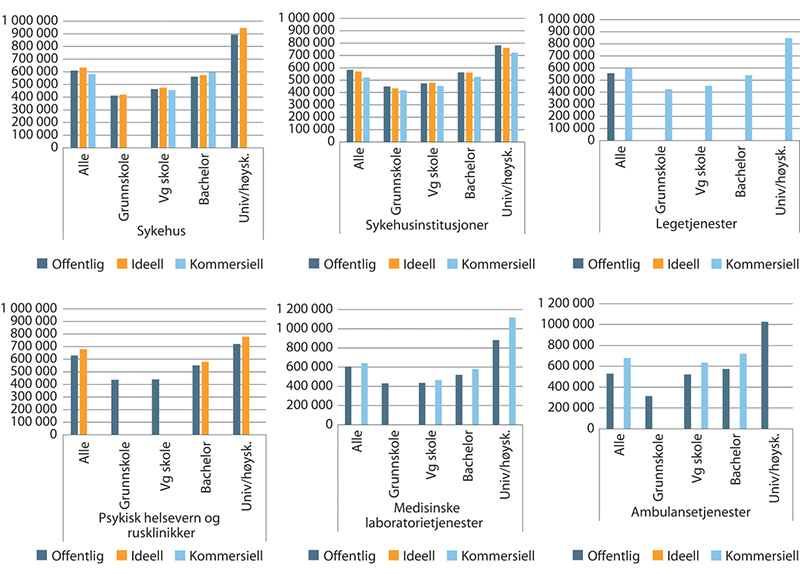 Innenfor gruppen sykehus ligger de ansattes lønn i ideelle virksomheter så vidt over de ansattes lønn i offentlige virksomheter både i gjennomsnitt og etter utdanningsnivå.8 For sykehusinstitusjoner er det innenfor de ulike utdanningsnivåene stort sett de offentlige som har høyest lønn og de kommersielle som har lavest. Innenfor psykisk helsevern og rusklinikker har de ideelle virksomhetene gjennomgående høyest lønn, mens for medisinske laboratorietjenester er det de kommersielle som har høyest lønn.