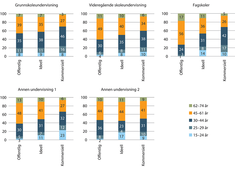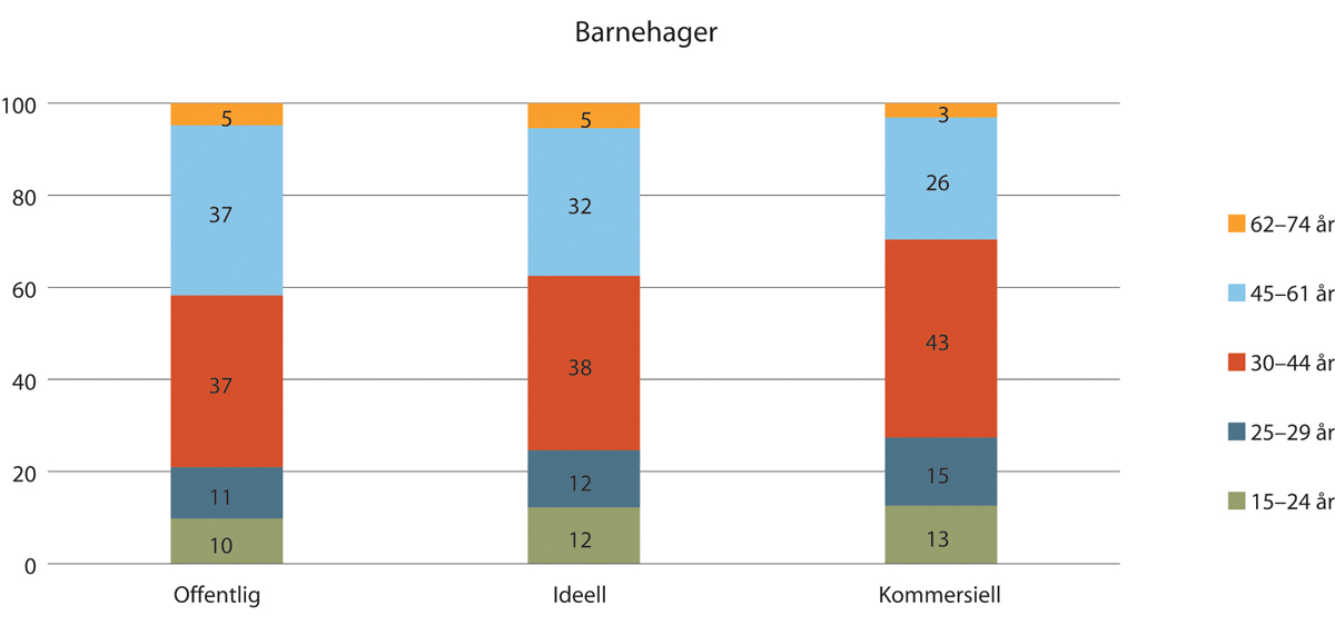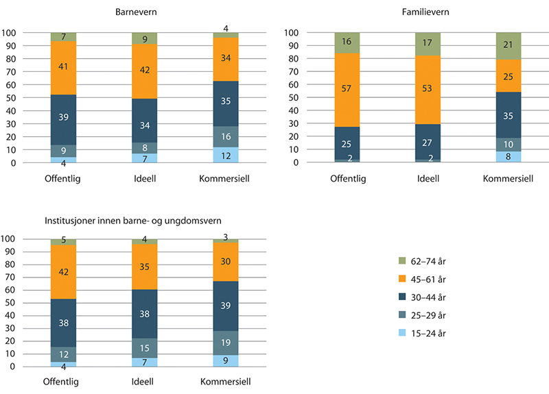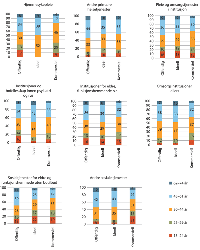 I figur 1.2 vises alderssammensetningen innenfor de ulike gruppene i spesialisthelsetjenesten. For noen av aldersgruppene presenteres ikke noe tall siden det er for få ansatte til å være representative. Figuren viser at aldersfordelingen innenfor hver gruppe (hhv. offentlig, ideell og kommersiell) stort sett er lik og at nesten halvparten eller fler er 45 år eller eldre.