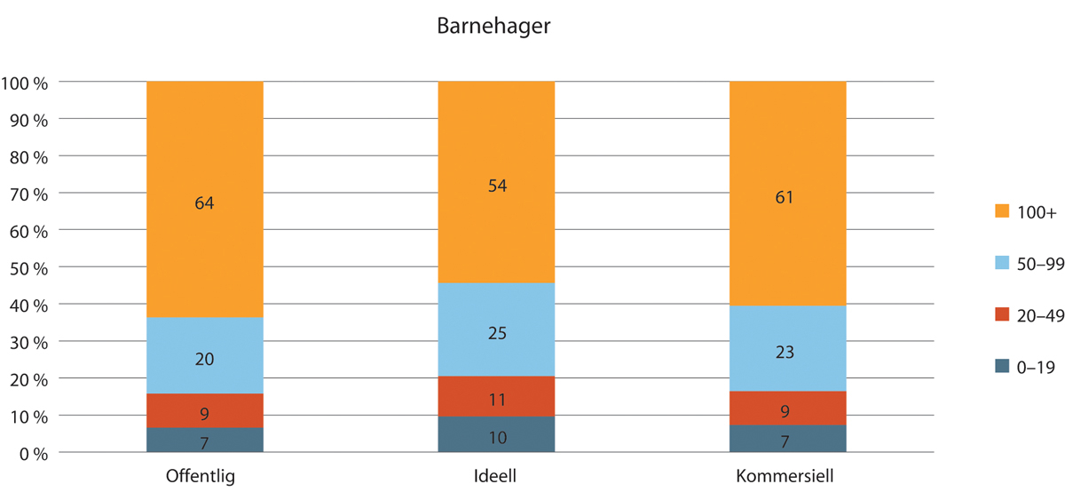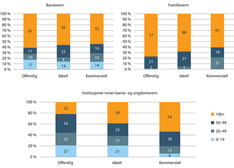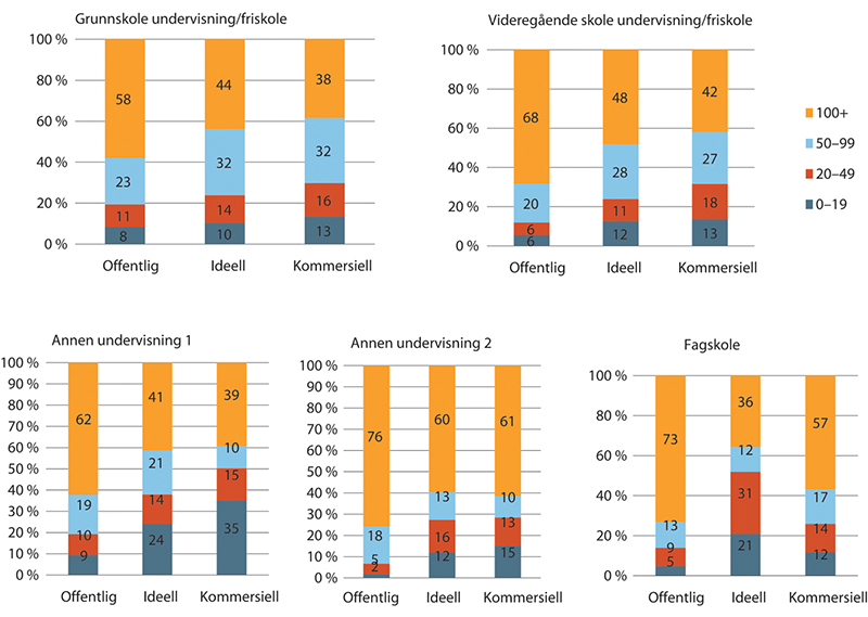 Kommersielle virksomheter har lavest andel med fulltidsstillinger med litt over 50 prosent. Ideelle har størst med 100 prosent. I offentlige virksomheter er litt under 60 prosent av arbeidsforholdene fulltidsstillinger.