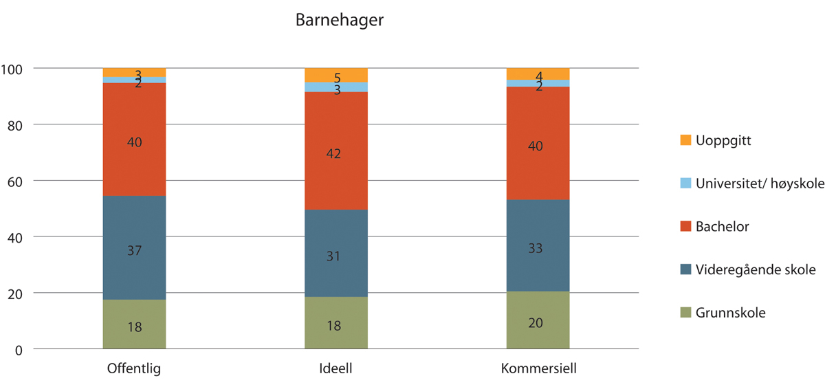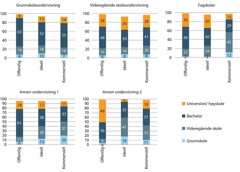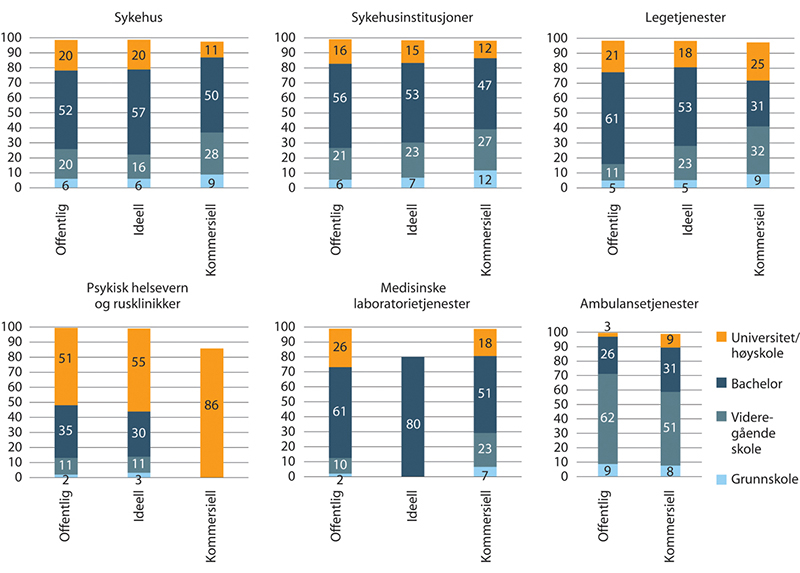 Innenfor de enkelte undergruppene er det ideelle sykehus som har flest ansatte med enten bachelor eller over. For sykehusinstitusjoner er de offentlige som har flest ansatte med høyere utdanning med litt over 70 prosent. Her skiller de kommersielle seg ut med at kun litt under 60 prosent av de ansatte har høyere utdanning.