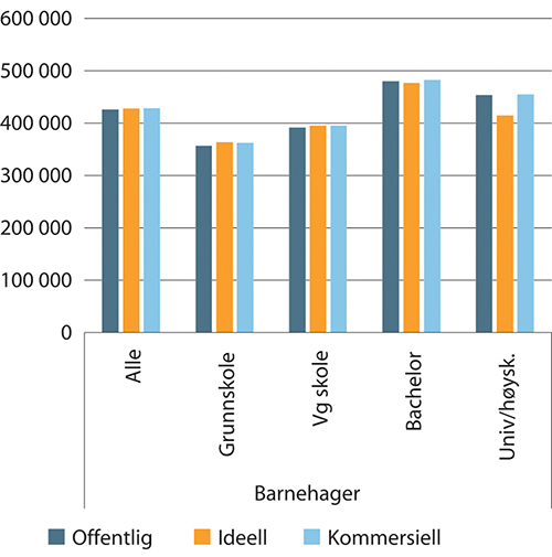 Figuren viser at lønnsnivået er noe lavere blant kommersielle virksomheter enn blant offentlige. Dette gjelder både ansatte med bachelorutdanning og i gjennomsnitt for alle arbeidsforhold.